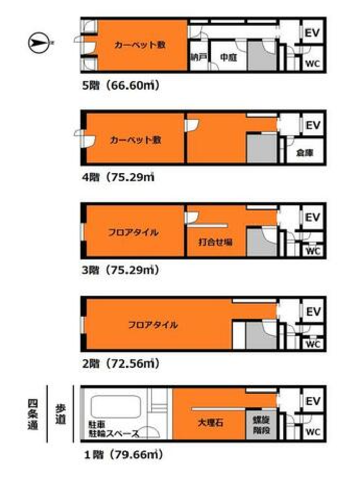 【四条烏丸エリア】四条通りに面した1棟ビル、5階建各階「66~79㎡」(延床面積369.4㎡)!物件前にバス停あり、その他地下鉄・阪急と交通便利な好立地です◎